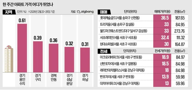지난주 전국 시·군·구 가운데 경기 용인 수지구의 아파트 가격이 한 주 동안 0.61% 올라 가장 많이 오른 것으로 나타났다. 한국부동산원 기준으로 경기 구리(0.39%), 경북 안동(0.36%), 경기 성남 분당(0.32%), 경기 하남(0.31%) 등이 뒤를 이었다.