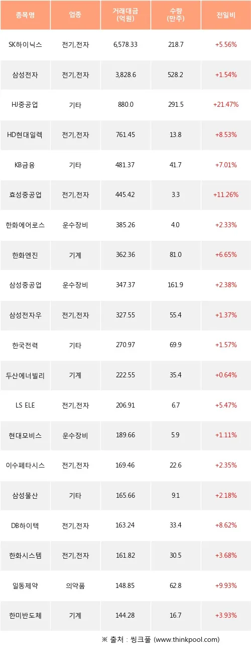 삼성전자는 외국인과 기관 투자자 모두의 최상위 매수 종목으로 나타났고, SK하이닉스도 양 투자자 그룹에서 꾸준히 순매수 상위권을 유지했다. 이외에도 기관 투자자들은 KB금융, KODEX 코스닥150레버리지, 신한지주 등을 주요 매수 종목으로 선택했으며, 외국인들은 삼성물산, 두산에너빌리티, HJ중공업 등을 집중 매수했다.