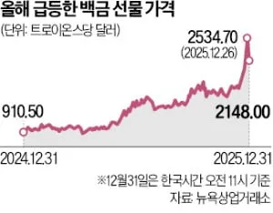 국제 백금 가격이 2025년 한 해 121% 올라 1987년 이후 38년 만에 최대 상승률을 기록했다. 31일 뉴욕상업거래소에서 백금 선물은 트로이온스당 2148달러에 거래 중이며, 지난 26일에는 사상 최고치인 2534.70달러를 찍었다.