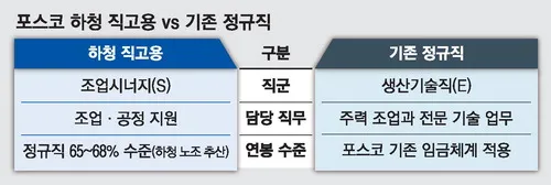 포스코가 사내 하청 근로자 7000여 명을 직접 고용하면서 별도 직군을 신설하고 분리된 임금 체계를 적용하겠다고 밝혔다. 기존 정규직 연봉의 65% 수준으로 예상되는 처우로 인해 하청 노조와 기존 정규직 간 갈등이 심화하고 있다.