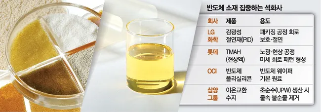 LG화학·롯데·OCI·삼양 등 석유화학 기업들이 반도체 공정 핵심 소재 분야로 빠르게 이동하고 있다. 롯데의 한덕화학은 현상액(TMAH) 생산 공장을 평택에 신규 건설 중이며, OCI는 폴리실리콘·인산·과산화수소 등 공정 소재 사업을 확대하고 있다. 삼양은 이온교환수지와 포토레지스트 소재를, LG화학은 반도체 패키징용 감광성 절연재 개발을 추진 중이다.