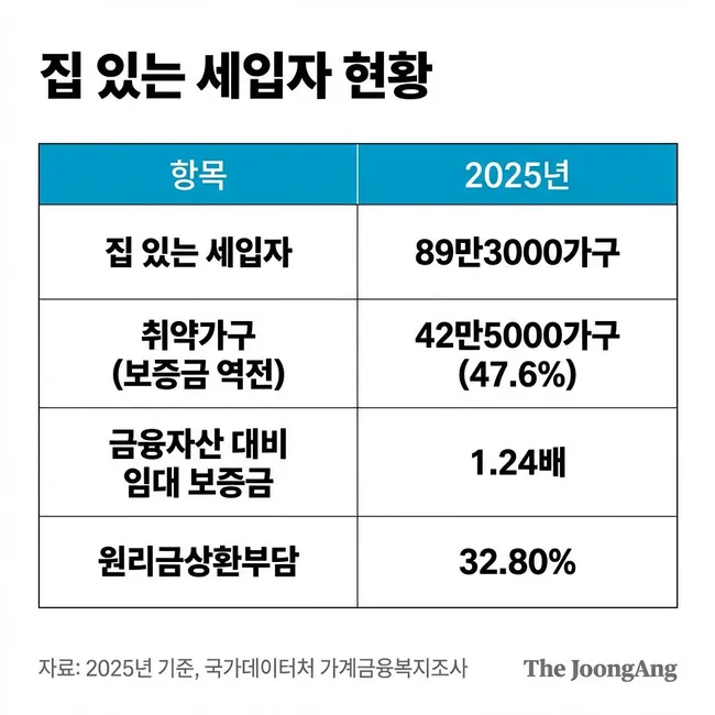 현재 '집 있는 세입자' 89만3000가구 중 47.6%인 42만5000가구가 이미 보증금 역전 상태로 재무 압박이 심각하다. 이들의 저축금액 대비 임대보증금 배율은 2.68배에 달하며, 원리금 상환부담 비율도 2023년 19.5%에서 지난해 32.8%로 급증했다.