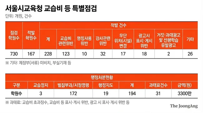 교육청은 3곳에 교습정지, 31곳에 3300만원 과태료를 부과했다. 교육부는 과징금·포상금 확대 등 제도 정비를 예고했으나 단속만으론 사교육비 부담 경감에 한계가 있다는 지적이 나왔다.