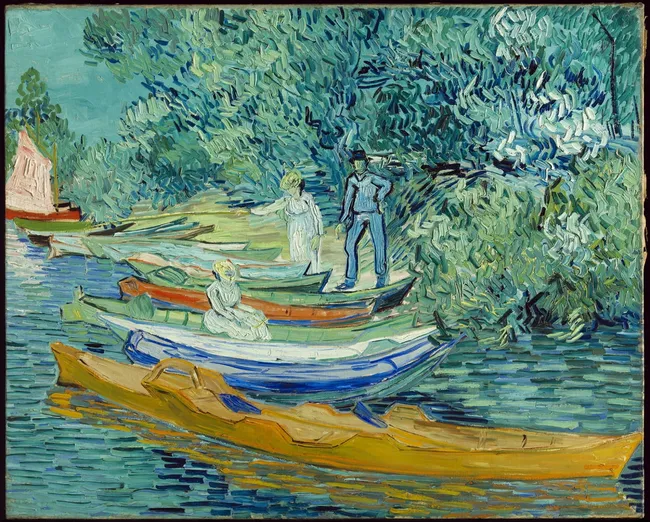 '오베르의 우아즈 강가'는 고흐가 생을 마감하기 한 달 전 그린 작품으로, 격정적인 그의 다른 작품들과 달리 수평적 안정감과 청량한 색채로 평온함을 표현했다. 우아즈 강변은 정신병원을 나온 고흐가 찾은 마음의 안식처였으며, 붓터치의 방향과 색채 대비가 그의 감정 상태를 여실히 드러낸다.
