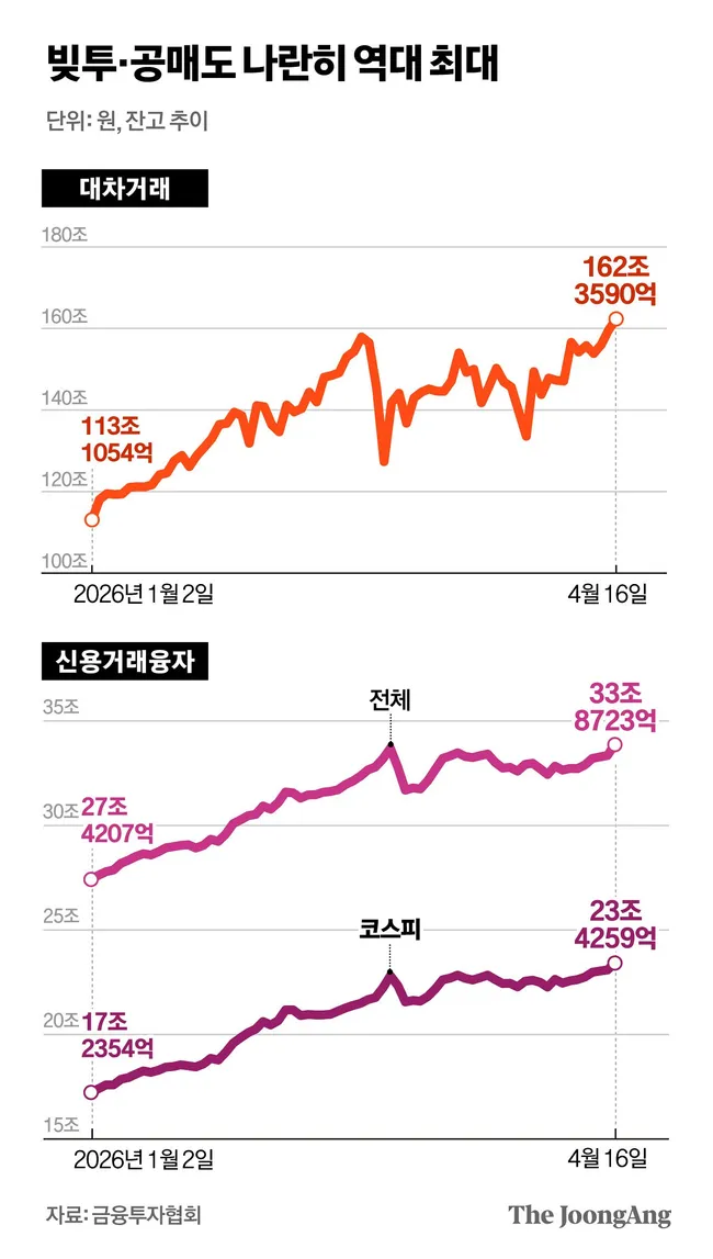 신용거래융자 잔고 33조8723억원, 공매도 대차거래 잔고 162조3590억원으로 동시에 사상 최대를 기록했다. 코스피 6000선 재돌파를 추가 랠리로 본 개인 투자자들의 빚투 증가와 하락에 베팅하는 공매도 세력이 동시에 극대화된 상황이다.