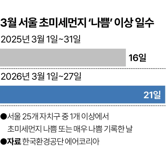 3월 서울 초미세먼지 농도 작년보다 31% 악화