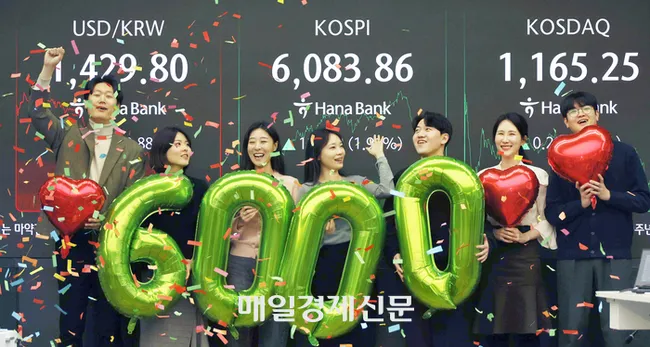 코스피가 25일 6083.86으로 장을 마감하며 사상 처음 6000선을 돌파했다. 지난달 27일 5000선을 뚫은 지 불과 18거래일 만의 쾌거로, 코스피 전체 시가총액도 5016조원으로 5000조원을 넘어섰다.