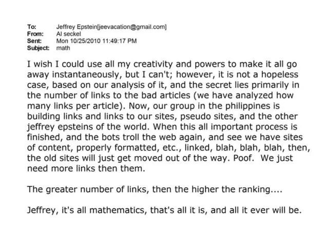 엡스타인과 세켈은 '필리핀팀'을 고용해 자선 사업과 과학자 육성 등에 관한 웹페이지를 무더기로 만들었다. 구글 검색 알고리즘을 악용해 링크를 통한 인용 횟수를 늘려 상위 노출을 유도했으며, 2012년에는 '엡스타인 감옥', '엡스타인 소아성애자' 같은 부정적 키워드 검색 결과까지 조작했다고 세켈이 메일로 보고했다.