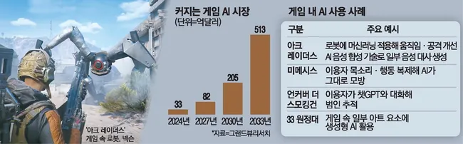 다만 게임 업계에서 AI 활용에 대한 반발도 커지고 있다. 아크 레이더스가 BAFTA 게임 어워드 후보에 오르자 영국 게임계에서 생성형 AI 활용을 문제 삼았고, 프랑스 게임 '클레르 옵스퀬: 33 원정대'는 AI 사용 사실을 알리지 않아 인디게임어워드에서 수상을 회수당했다. 그랜드뷰리서치는 게임 AI 시장이 지난해 33억달러에서 2033년 513억달러로 성장할 것으로 전망했다.