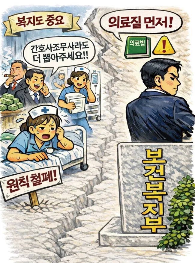 보건복지부가 요양병원의 간호사 비율 가산제를 둘러싼 의료계의 규제 완화 요구를 거부하고 현행 기준 유지를 확정했다. 간호조무사 추가 채용 시 간호사 비율이 66.7% 미만으로 떨어지면서 수천만 원의 가산금을 못 받는 '채용의 역설'이 발생하고 있으나, 복지부는 전문성 강화가 중요하다며 예외 조항 신설을 거부했다.