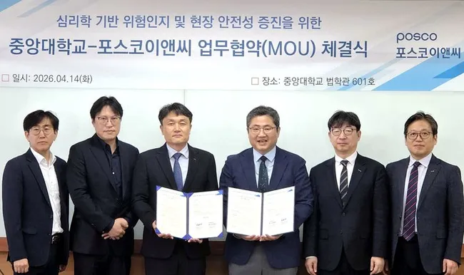 포스코이앤씨가 중앙대학교 심리학과와 '심리학 기반 위험인지 및 현장 안전성 증진 방안 연구' 업무협약을 체결했다. 안전관리 범위를 시설·장비에서 근로자의 인지와 행동 특성까지 확장한다.