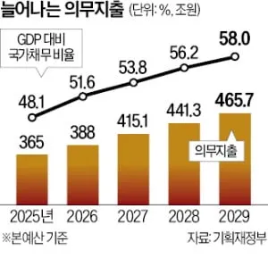 정부의 2025~2029년 국가재정운영계획에 따르면 국가채무는 2029년 1788조9000억원으로 373조7000억원이 추가 증가할 것으로 예상된다. 내년부터 3년간 국가채무는 초당 395만234원씩 쌓일 전망이며, 추경 편성 등으로 증가 속도가 더욱 빨라질 가능성도 있다.