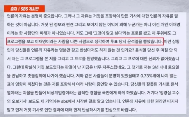 이재명 대통령이 24일 '그것이 알고 싶다' 보도를 보고 윤석열 전 대통령을 뽑았다는 게시글을 공유했다. 해당 글 작성자는 거짓 보도 판결이 난 지금 후회스럽다고 적었다.