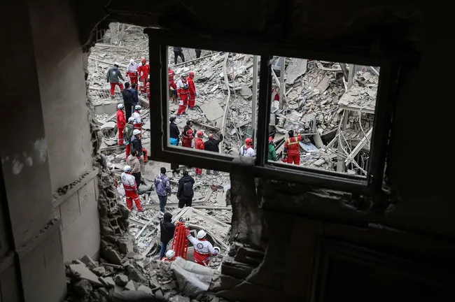 미국과 이스라엘의 공습으로 이란 테헤란의 건물이 무너져 16일 구조대원들이 긴급 구호활동을 펼쳤다.
