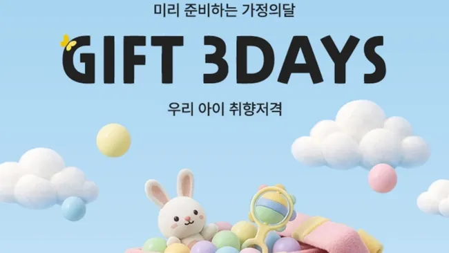 SSG닷컴이 4월 20~22일 '유아동 GIFT 3 DAYS' 행사를 통해 완구·패션·육아용품을 최대 27% 할인한다. 5월 1일 노동절 공휴일 지정으로 연휴가 길어지면서 선물 구매 시점이 앞당겨졌다.