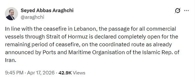 이란이 레바논 휴전에 맞춰 호르무즈해협 상선 통항 제한을 전면 해제했다. 이란 외교장관은 17일 소셜미디어를 통해 21일까지 모든 상업용 선박의 통행을 완전히 허용한다고 밝혔다.