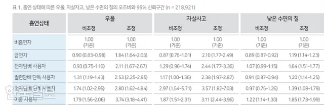 질병관리청이 5일 공개한 지역사회건강조사 분석 결과에 따르면 흡연자의 우울 정도가 비흡연자보다 2.5배 이상 높으며, 궐련과 전자담배를 모두 사용하는 이중 사용자는 3배 이상 높게 나타났다.