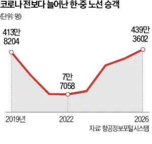 일본과 동남아시아 노선은 이미 포화 상태로 수익성이 둔화한 반면, 중국 노선은 무비자 정책과 여행 수요 증가로 올해 1분기 한·중 노선 승객이 439만 명으로 2019년 1분기를 초과했다. 고유가 상황에서 운항 시간이 짧은 중·단거리 노선이 수익성 측면에서 유리하며, 5월 연휴 상품 중 중국 비중이 약 30%로 일본을 앞섰다.