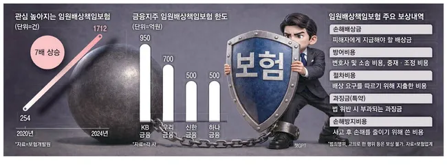 국내 손해보험업계의 임원배상책임보험 계약건수가 2020년 254건에서 2024년 1712건으로 4년 만에 7배 급증했다. 보험료도 500억원대에서 2024년 672억원으로 늘었으며, 상장기업 가입률은 2003년 30%에서 2023년 70%로 확대됐다.