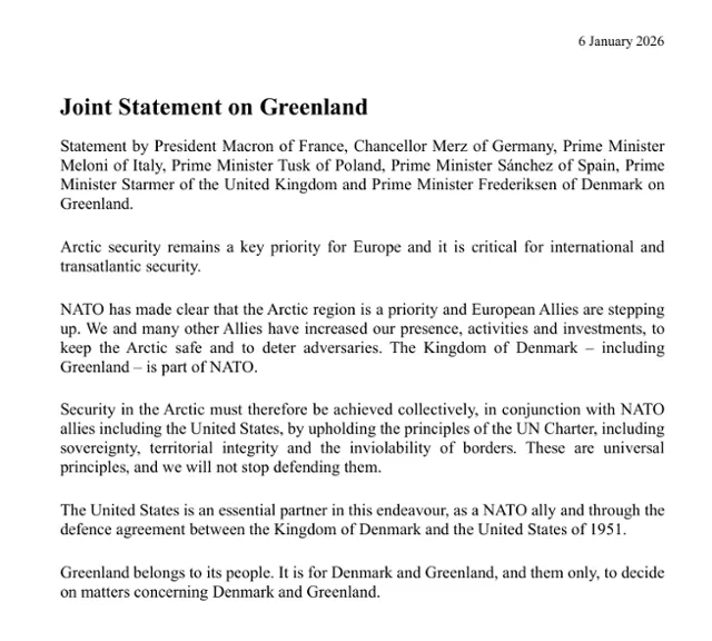 영국, 프랑스, 독일 등 7개국 정상은 공동 성명을 통해 그린란드는 그린란드 주민과 덴마크의 소유이며, 덴마크와 그린란드만이 관련 사안을 결정할 수 있다고 강조했다. 북유국가들 또한 그린란드 사안은 덴마크와 그린란드가 독자적으로 결정해야 한다는 입장을 지지했다.
