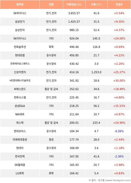 외국인 투자자가 거래소에서 SK하이닉스, 삼성전기, 삼성전자 등 전기전자 업종을 집중 매수했다. 순매수 상위 20개 종목 중 전기전자 업종이 6개를 차지했다.