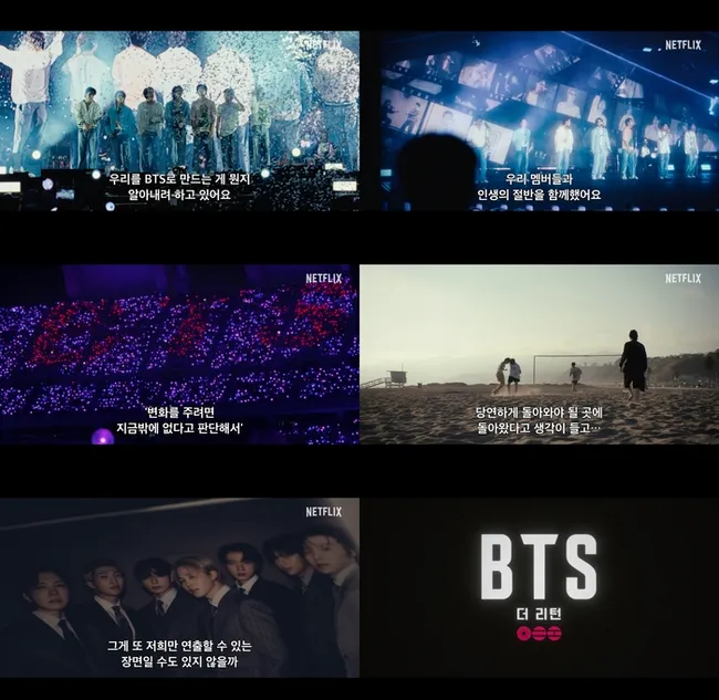 방탄소년단이 정규 5집 '아리랑' 작업 과정을 담은 다큐멘터리 영화 'BTS: THE RETURN' 예고편을 17일 오전 8시 공식 SNS에 공개했다. 전통 민요 '아리랑'을 배경음악으로 삽입해 팀의 정체성과 시작점을 되짚었다.