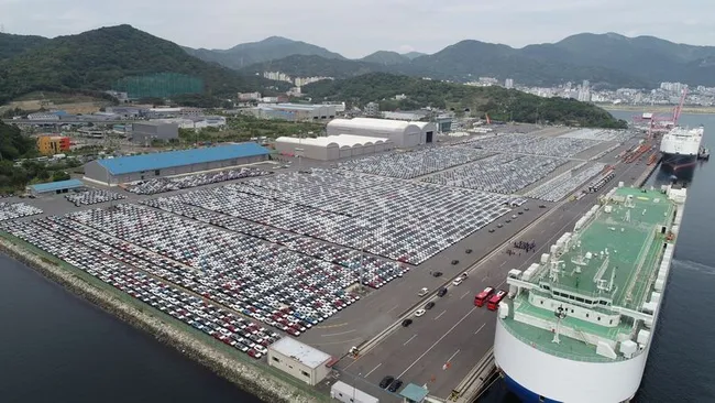 GM 한국사업장이 생산한 쉐보레 트랙스 크로스오버 약 7000대가 경남 창원 마산 가포신항 야적장에서 미국행 선박을 기다리고 있다. 마산 가포신항은 2023년 트랙스 본격 양산 이후 물동량이 3만2000대(2022년)에서 25만6000대(2025년)로 급증했으며, 올해는 역대 최대인 연간 30만대 선적을 목표로 하고 있다.