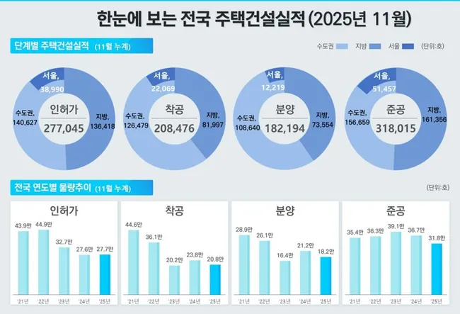 반면 전월세 거래는 20만8002건으로 전월 대비 4.1% 증가했고, 수도권 전월세는 13만8957건으로 3.9% 증가했다. 서울 지역 분양은 11월에 0건을 기록했으며, 11월까지 누적 분양 실적은 1만2219가구로 지난해 같은 기간(2만6084가구) 대비 53.2% 감소했다.