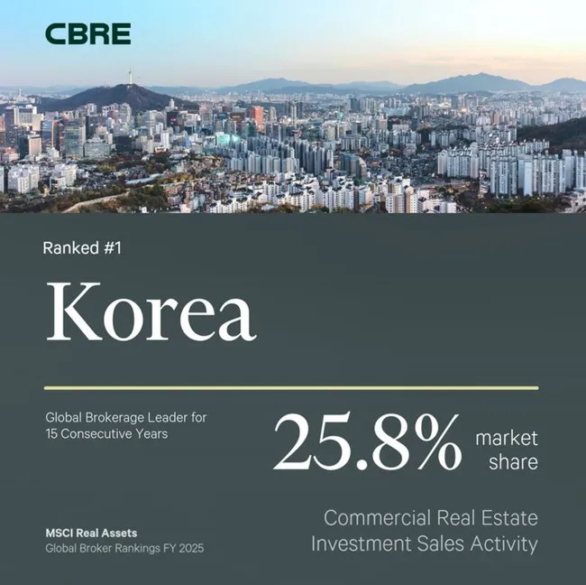 CBRE 코리아가 2025년 한국 상업용 부동산 투자자문 시장에서 7년 연속 1위를 기록했다. 거래 규모는 52억6400만달러로 전년 대비 118% 증가했고, 시장점유율은 25.8%로 7%포인트 상승했다.