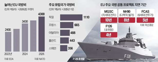 러시아·우크라이나 전쟁과 미국·이란 전쟁 여파로 재무장을 추진하는 유럽이 국가 간 규제와 이해관계 불일치로 공동 무기 개발에 어려움을 겪고 있다. 독일의 F126 호위함 사업은 사업비가 53억유로에서 160억~180억유로로 3배 이상 증가했으며, 소프트웨어 오류와 관료주의로 초도함 인도가 4년 밀렸다.