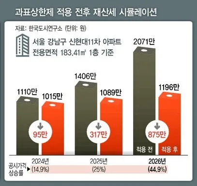 서울 고가 아파트 보유자들이 윤석열 정부의 재산세 과표상한제와 보유세 세 부담 상한제 축소로 1명당 200만원에서 1300만원대의 감세 혜택을 받은 것으로 분석됐다. 한국도시연구소가 서울 주요 고가 아파트의 최근 3년(2024~2026년) 보유세 부담을 분석한 결과, 강남구 압구정동 신현대11차 보유자는 재산세를 1288만원 할인받았으며 용산구 한남더힐은 1237만원을 감면받았다.