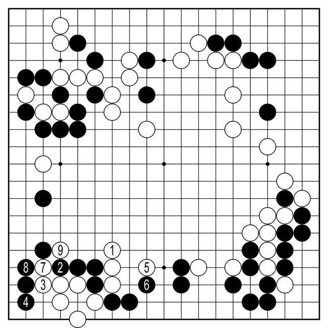 실전은 AI의 판단과 달리 백1에 이어 백3의 최강수로 귀를 죽이는 길을 선택했다. 이는 형세 비관에서 나온 파격적인 수읽기로, 후수로 귀를 사는 것보다 직접 죽이는 전략을 택한 것이다.