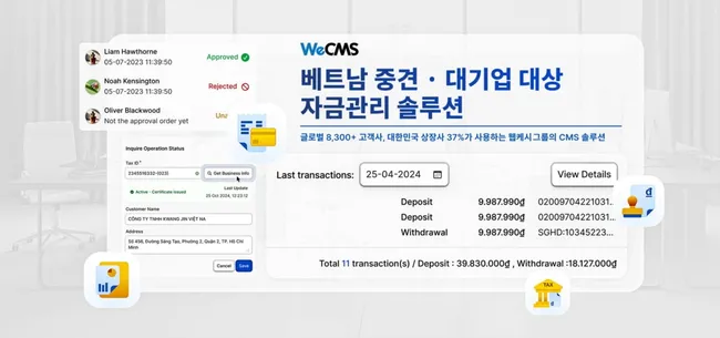 WeCMS는 베트남 은행 및 국세청과 연동해 매출·매입 관리, 실시간 자금 흐름 모니터링, 환율 조회, 법인카드 관리, 전자세금계산서 발행, ERP 연계까지 통합 지원한다. 권한 관리 기반 내부 통제 기능으로 횡령 리스크도 사전 차단할 수 있다.