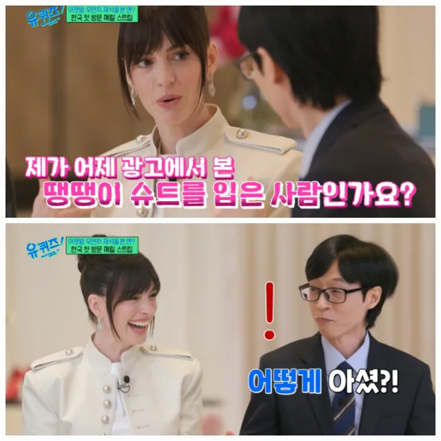 앤 해서웨이가 15일 방송된 tvN '유 퀴즈 온 더 블럭'에서 유재석을 먼저 알아보며 뜻밖의 장면을 연출했다. 앤 해서웨이는 유재석과 마주하자마자 "땡땡이 슈트를 입은 분 맞냐"며 광고에서 본 것 같다고 물어 현장을 놀라게 했다.