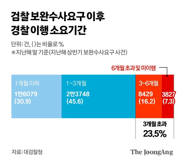 검찰이 보완수사를 요구하면 사건이 검찰청 사건번호에서 제외돼 관리가 불가능한 구조적 문제가 드러났다. 수사준칙상 3개월 이행 원칙이 있으나 강제 방법이 없어 지난해 상반기 보완수사 요구 5만2083건 중 23.5%가 3개월을 초과했다.