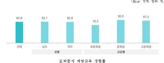 청소년 82.8%가 학교에서 도박문제 예방교육을 받은 경험이 있어 도박 진입을 효과적으로 억제하고 있는 것으로 평가된다. 정부는 2026년부터 초·중·고교 학생 대상 도박 예방교육을 연 2회 이상 의무화함에 따라, 강화된 제도적 기반이 청소년 도박 예방에 실질적으로 기여할 것으로 전망하고 있다.