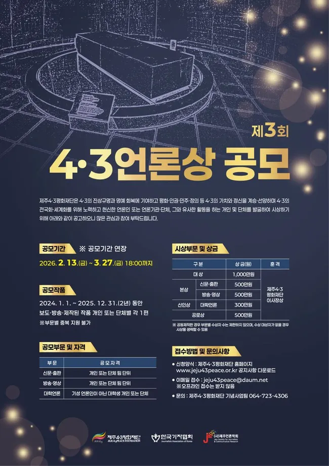 제주4·3평화재단은 한국기자협회, 제주언론학회와 공동으로 제3회 4·3언론상 후보작을 추가 모집하며 접수 기간을 3월 27일까지 연장했다.