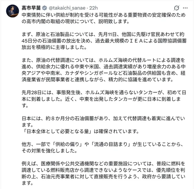 다카이치, “필요한 석유 확보됐다”…日 내년 초까지는 버틴다