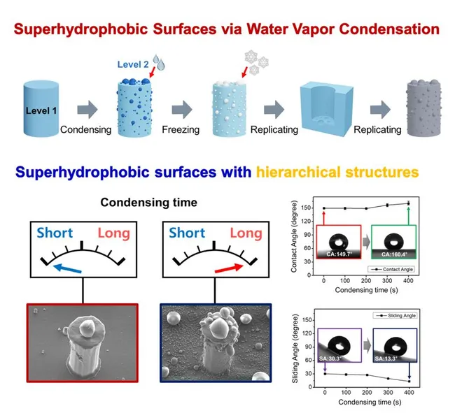 동아대학교 기계공학과 이성호 교수 연구팀이 수증기 응결 현상을 활용해 마이크로 스케일의 계층적 초발수 표면을 저렴하게 제작하는 공정 기술을 개발했다. 열전 소자로 기존 마이크로 구조체 위에 수증기를 응결시키고 급속 동결해 복제하는 방식으로, 고가 장비와 복잡한 미세 가공 공정 없이도 초발수 표면을 만들 수 있다.