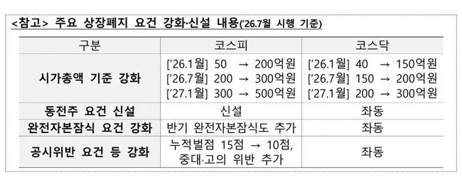 금융감독원이 조사·공시·회계 부서 합동 대응체계를 구축하고 상장폐지 회피 불법행위 집중 감시에 착수했다. 7월부터 시총 기준이 코스피 300억원·코스닥 200억원으로 강화되고 주가 1000원 미만 동전주 요건이 신설되면서 한계기업의 시세조종·분식회계 시도가 급증할 것으로 예상됐다.