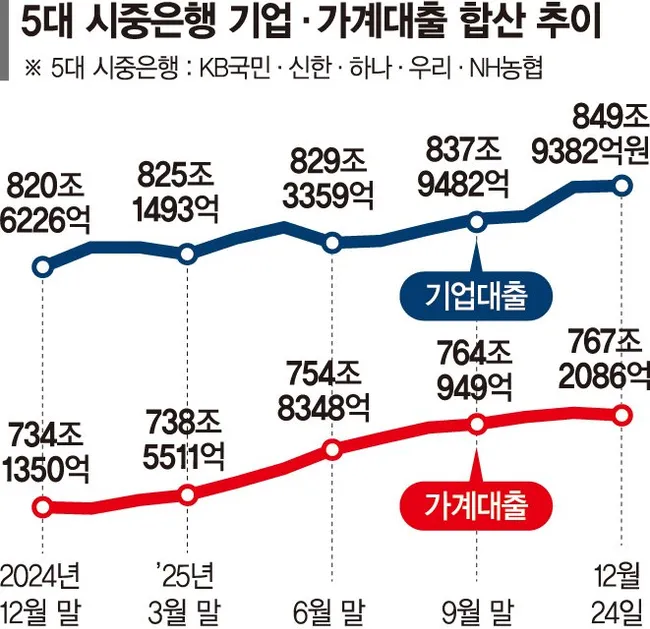 2025년 은행권은 가계대출 중심의 외형 확장에서 벗어나 산업·기업금융으로 방향을 전환했다. 5대 시중은행의 기업대출 잔액은 849조9382억원으로 지난해 말보다 3.57% 증가했으며, 특히 하반기에만 19조8425억원이 늘어났다. 반면 가계대출은 상반기 월평균 3조4499억원 증가에서 하반기 월평균 2조623억원으로 증가 폭이 축소됐고, 12월에는 순감소로 돌아섰다.