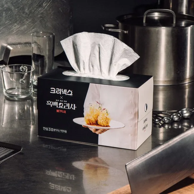 유한킴벌리가 13일 넷플릭스 예능 '흑백요리사: 요리 계급 전쟁 시즌2'와 협업한 '크리넥스 뽑아쓰는 키친타월 흑백요리사 에디션'을 출시했다. 한 손으로 뽑아 사용하는 각티슈 타입으로 청결하고 위생적인 보관이 가능하다.