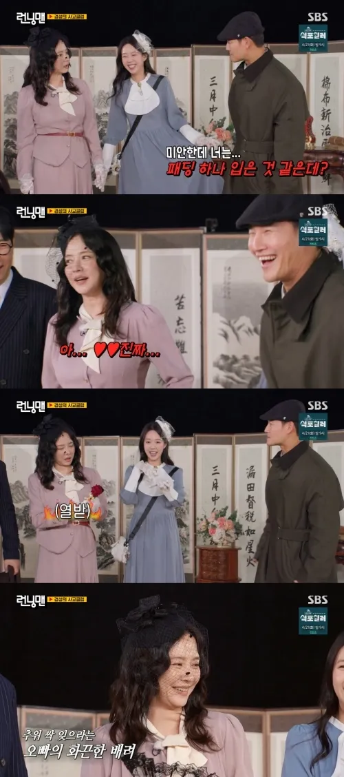 이날 방송은 1945년을 배경으로 멤버들이 시대에 맞춰 옷을 입는 코너였다. 유재석은 날씨 변화에 따른 멤버들의 복장 차이를 언급했고, 김종국은 송지효에게 패딩을 많이 입었다고 디스했다.