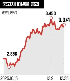 10년 만기 국고채 금리가 지난해 10월 연 2.8%에서 1일 연 3.374%로 한 달 반 만에 0.5%포인트 상승했다. 채권 금리 상승은 채권 가격 하락으로 이어져 투자자들의 평가손실이 불가피한 상황이다.