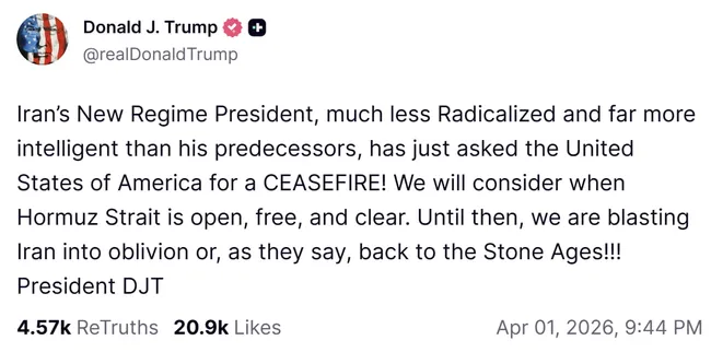 트럼프 미국 대통령이 1일 이란 새 지도자로부터 휴전 요청을 받았다고 밝혔다. 호르무즈해협 완전 개방과 자유 통행 보장을 전제로 휴전을 검토하겠다는 입장이다. 그 전까지 군사적 압박을 지속하겠다고 경고했다.
