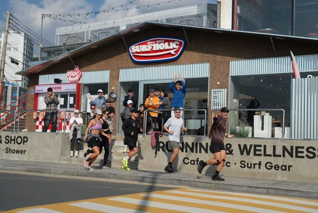 서프홀릭은 기존 서핑 교육 경험을 바탕으로 러닝·웰니스까지 확장한 해변 라이프스타일 플랫폼 구축에 나섰다. 개소일 부산 러닝 커뮤니티 BRC 크루가 해변 러닝 후 공간에서 교류했다.
