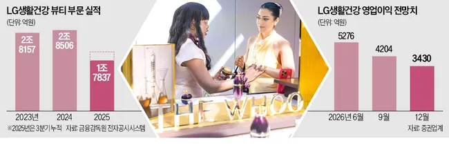 LG생활건강의 영업이익이 2021년 1조2896억원의 정점에서 2023년 4869억원으로 급락했다. 중국의 '애국 소비' 트렌드 확산과 코로나19 사태가 겹치면서 실적이 악화했으며, 올해 영업이익 전망치는 2662억원으로 지난해보다 42% 감소했다.