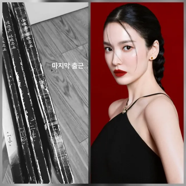 배우 송혜교가 10일 SNS에 '천천히, 강렬하게 마지막 출근'이라는 글과 함께 손에 쥔 네 권의 대본 사진을 공개하며 촬영 종료를 알렸다. 손때가 묻고 가장자리가 닳은 대본들은 약 1년간의 긴 촬영 여정의 무게를 전하고 있다.
