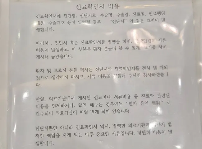 지난해 전체 의료기관의 일반 진단서 발급 수입은 1368억원에 달했으며, 상한액을 어겨도 시정 명령이나 행정지도 정도만 부과돼 실질적 제재가 부족하다. 통원·진료 확인서는 3000원이 상한액이지만 20만원을 받는 기관도 있어 상한선의 67배를 초과했다.