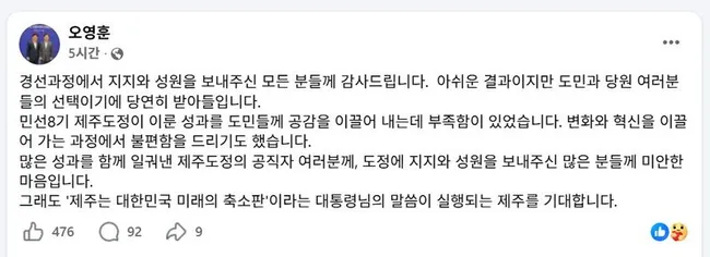 오 후보는 11일 SNS를 통해 경선 결과를 받아들이겠다는 뜻을 밝혔다. 그는 "도민과 당원 여러분들의 선택이기에 당연히 받아들인다"고 했으며 도정 공직자들과 지지층에 대한 미안함을 표현했다. 도정 성과를 설득력 있게 전달하지 못한 점을 패배의 원인으로 지적했다.
